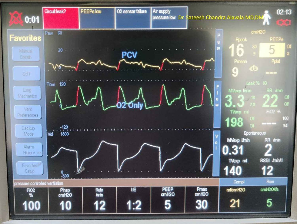The presence of a leak can be confirmed by the volume–time scalar failing to return to baseline before the onset of the next breath.