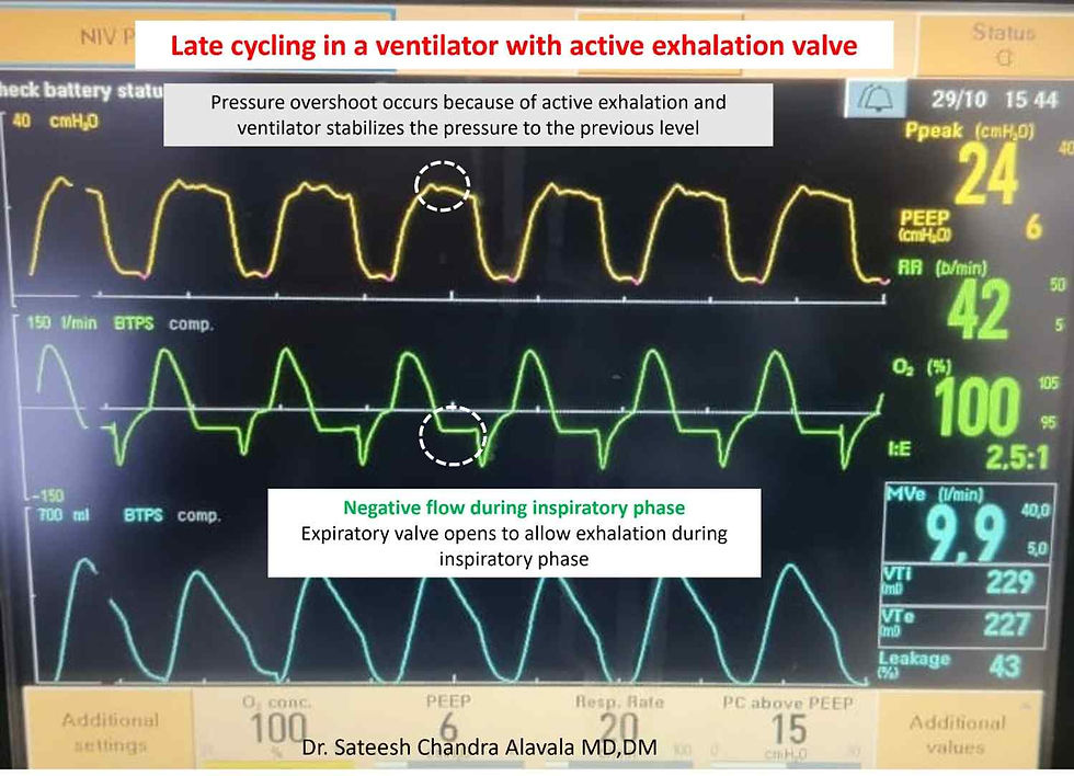 Late cycling can be recognized on ventilator waveforms by a pressure spike on the pressure-time scalar during inspiration, accompanied by a rapid return of inspiratory flow to baseline and a brief zero-flow period. In some cases, particularly when the ventilator has an active exhalation valve, the inspiratory flow even may cross the baseline, producing a brief negative flow as the patient begins to exhale.